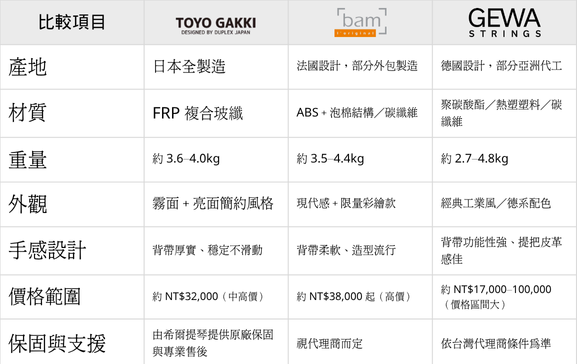 Toyo Gakki 以日本國產穩定工藝為基礎,在中高價位帶中提供極具競爭力的輕量琴盒選擇,品質優於同價位品牌,保護性與日常實用性並重。。